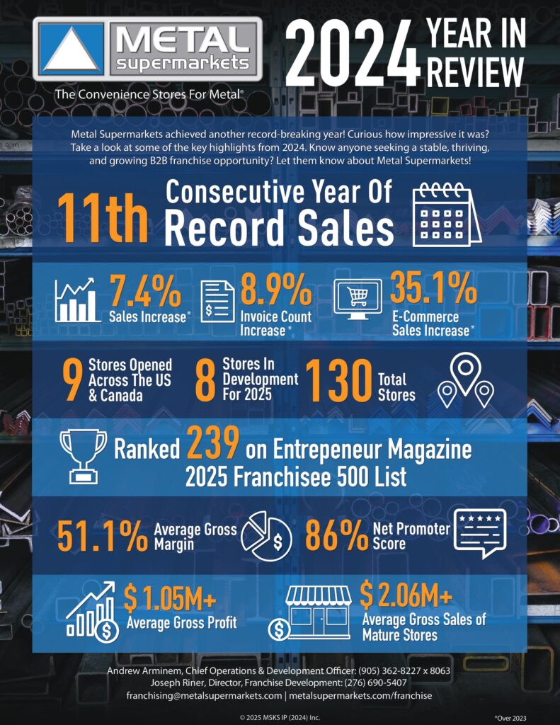 “We’re very pleased with calendar 2024’s results and many significant achievements by our franchisee partners,” said Stephen Schober, President and CEO of Metal Supermarkets. “By focusing on customer satisfaction and loyalty, our network achieved strong sales results, while, at head office, we continue to bolster information technology enhancements, furthering our eCommerce offering and increased marketing investment. And we are excited to enter 2025 solidifying Metal Supermarkets position as a market leader in all of our markets.”