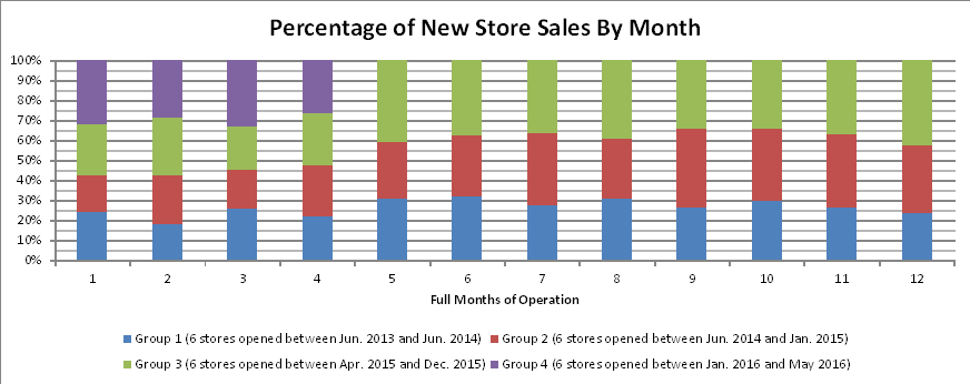 When looking at new stores grouped chronologically since June 2013, the newest grouping of 6 stores – opened between January to May 2016 – averaged higher monthly sales than the previous groupings in all 4 of their first full months of operation. This is not an isolated trend. Group 3 – consisting of stores opened between April to December 2015 – also achieved higher average sales than the groups preceding it in 8 of their first 12 full months, while also exceeding average monthly sales in 11 of those months. The first 12 month average sales also progressed with each group, with Group 2 achieving 19% average sales growth over Group 1, and Group 3 achieving 10% higher averages sales than Group 2. The graph below illustrates these results.